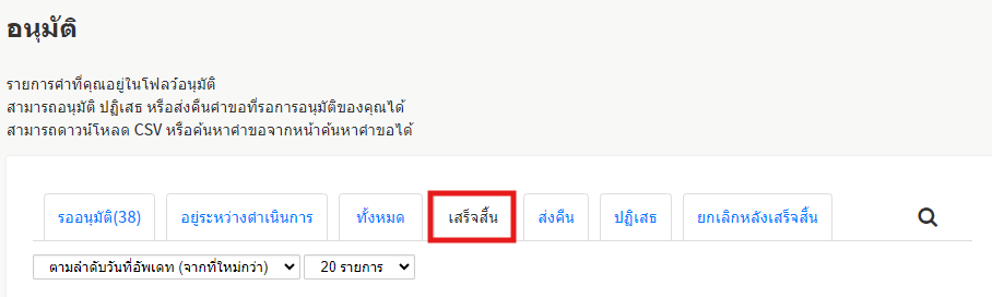 2. รายการคำขอที่ตนเองถูกกำหนดให้เป็นผู้อนุมัติจะปรากฏขึ้น เลือกที่ปุ่ม 「เสร็จสิ้น」แล้วคลิ๊ก ที่ด้านขวาบน