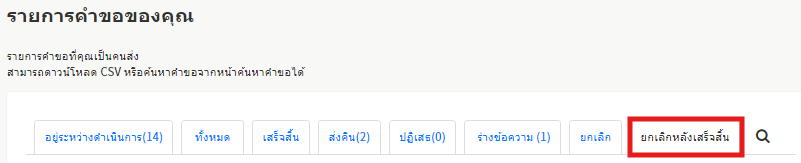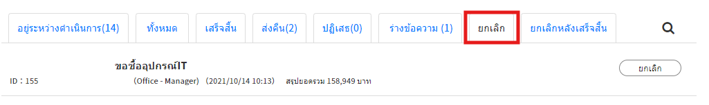 · ผู้ส่งคำขอ ตรวจสอบคำขอที่ถูกยกเลิกหลังจากที่มีการอนุมัติในขั้นตอนสุดท้ายเสร็จสิ้นแล้ว