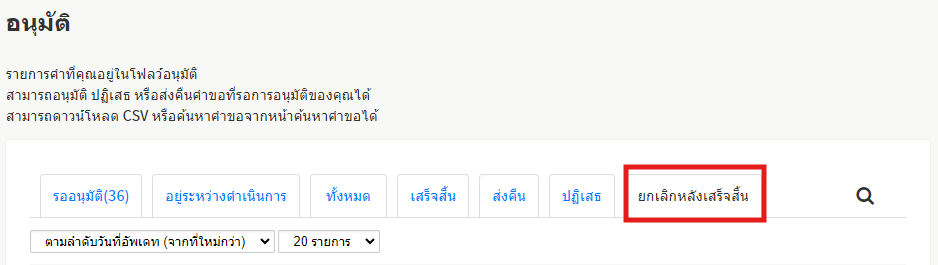 · ผู้อนุมัติคำขอ ตรวจสอบคำขอที่ถูกยกเลิกหลังจากที่มีการอนุมัติในขั้นตอนสุดท้ายเสร็จสิ้นแล้ว