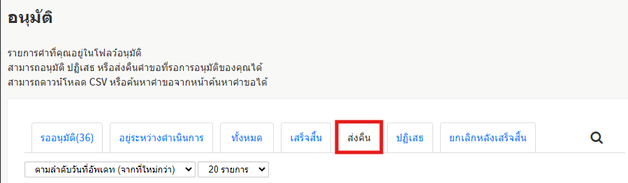2. เลือก「ส่งคืน」ในหน้าจอ 「อนุมัติ 」รายการคำขอที่ถูกส่งคืนจะปรากฏขึ้น