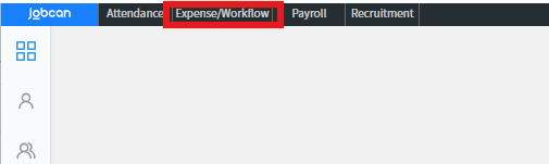1. แสดงผลที่หน้าจอของ Jobcan Workflow เป็นหน้าจอที่ปรากฏขึ้นทันทีหลังจากล็อคอิน เลือก「Expense/Workflow」ที่อยู่ในกรอบสีแดง ตรงมุมซ้ายบนตามรูปด้านล่างนี้ แล้วหน้าแรกของ Jobcan Workflow จะปรากฏขึ้น