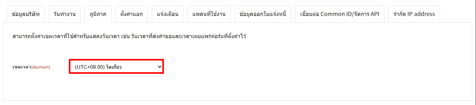 3. ในหน้า "ข้อมูลบริษัท" ให้คลิกเลือก "ภูมิภาค" จะมีเขตเวลาแสดง