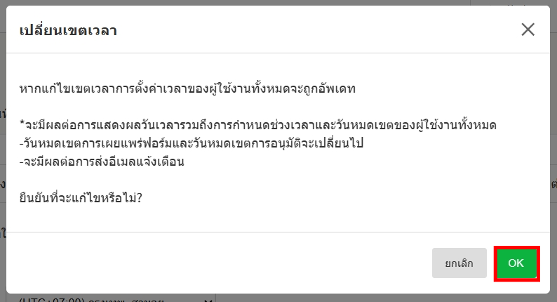2. เมื่อกดเลือกเขตเวลาใหม่ ระบบจะปรากฏกล่องข้อความเพื่อยืนยันการเปลี่ยนการตั้งค่าเขตเวลา ให้กด "OK" เพื่อยืนยัน